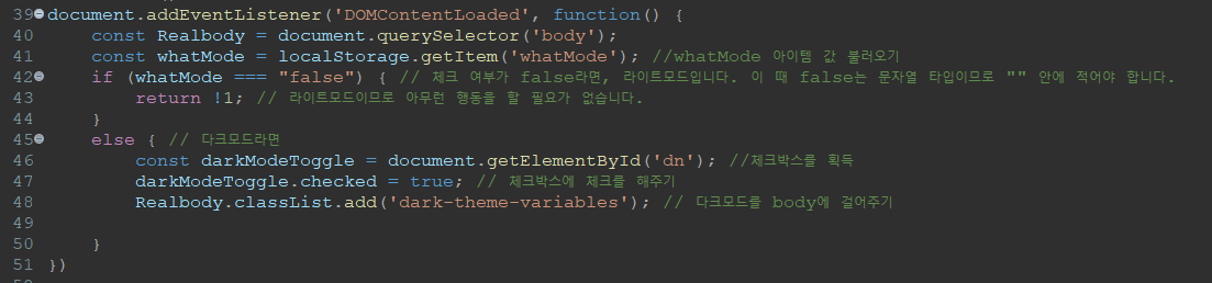 29번라인의 localStorage는 브라우저에 값을 저장해주는 저장소인데, localStorage를 사용하지 않고 구현을 하게 된다면 다크모드로 전환 후 창을 새로고침 할 시에 다크모드가 풀려버리는 이슈가 생긴다. 그렇기 때문에 현재의 모드를 localStorage에 저장해줘서 현재 모드가 어떤 모드인지 판단을 해주는 것이다.